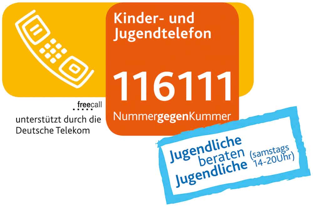 Die Nummer gegen Kummer 11 61 11 ist montags bis freitags von 14:00-20:00 Uhr erreichbar. Samstags von 14:00-20:00 Uhr haben wir ein besonderes Angebot: zu dieser Zeit kannst du bei Jugendliche beraten Jugendliche exklusiv mit Jugendlichen telefonieren.